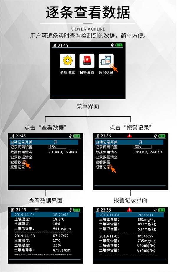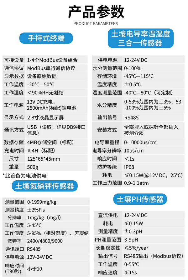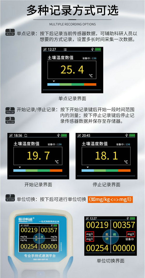 土壤参数速测平台又称手持式土壤参数速测仪,可以监测PH、氮磷钾、电导率、温湿度等参数,即插即测,数据实时显示,数据可从电脑导出,测量速度快。