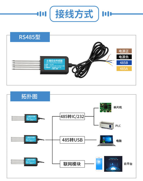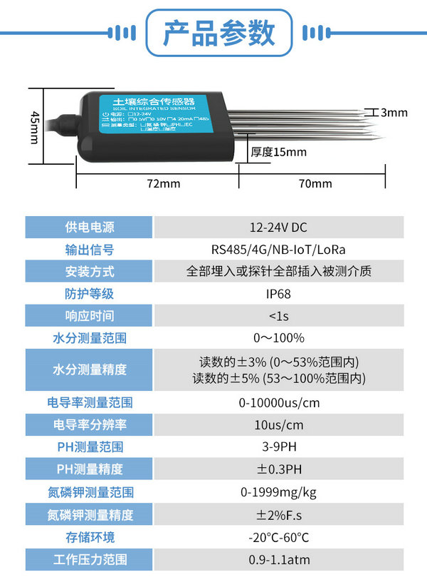 土壤综合传感器可以同时监测氮磷钾、PH、电导率、温度、湿度五种参数,测量,使用方便,支持无线远程查看数据。