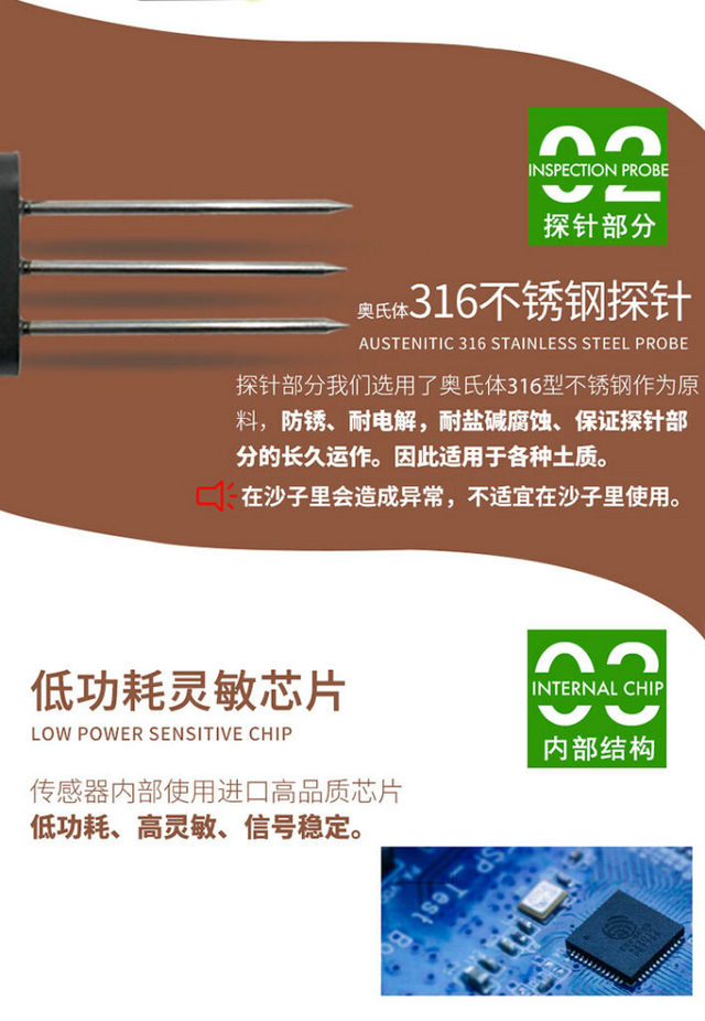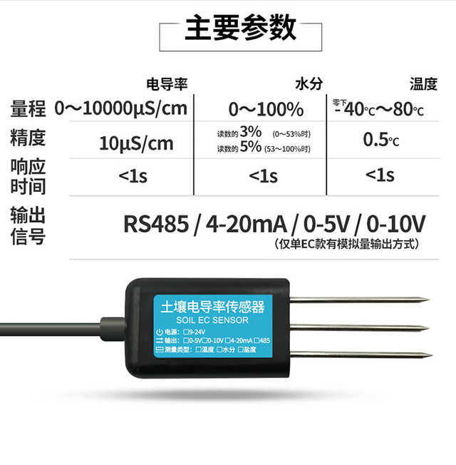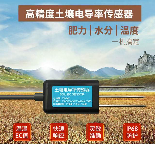 土壤电导率传感器主要用于测量土壤中盐分的的含量,测量准确,灵敏度高,耐盐碱耐腐蚀,可广泛应用于农业,温室大棚等场景。