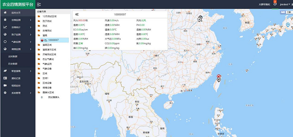 平台支持实时查看所测环境的各项数据。数据可以通过电子地图界面、列表等方式反映,电子地图界面的优势在于让用户直观看到数据和传感器相对位置,列表则更利于用户对数据进行对比。