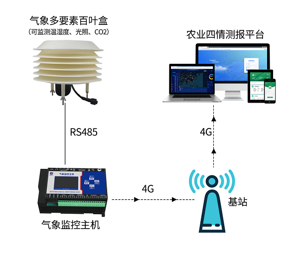 该系统主要针对不同面积和不同区域的生态大棚安装气象多要素百叶盒,全面检测生态大棚中二氧化碳的浓度值。安装在各区域内的气象多要素百叶盒通过485通信将监测到的光照、温湿度、二氧化碳浓度等数据传至气象监控主机,监控主机通过4G通讯网络上传至农业四情测报平台;同时,当任一区域二氧化碳浓度超过预设报警值时,系统会自动报警并控制二氧化碳供给开关,实现对生态大棚CO2浓度状况的集中远程监控。