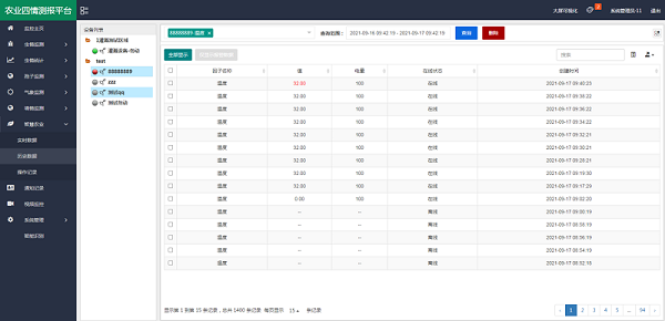 可通过系统查询每个监测点的设备信息,对设备监测数据、历史数据进行查询。报警数据会以红色显示,支持生成数据曲线图,具有单个或多个因子数据存储/查询/导出数据功能,支持PDF、excel等多种数据格式导出。同时可导出数据查询的时间段、查询数据账号、设备电量、设备在线状态等重要信息。