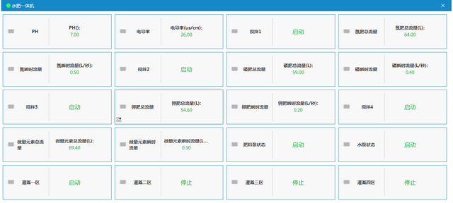 远程管理:云平台主动接收水肥一体机控制器通过GPRS上传的所有数据,并将其在界面显示:能实时显示水泵和肥料泵的开关状态;4个肥料桶各自的搅拌状态、瞬时流量及总流量;管道内的混合肥料的实时EC和PH值以及12路灌溉区的灌溉状态等信息。
