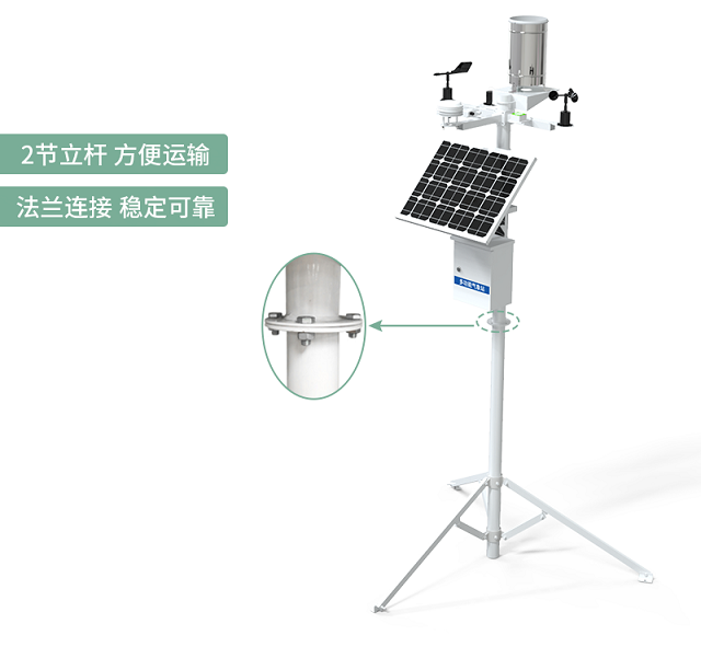 气象站整体立杆采用2节法兰连接,现场接线简单,连接可靠,安装稳定,方便运输。立杆采用高屈服强度碳钢,特有的防锈耐腐蚀工艺,能够长期用于恶劣的户外环境,在恶劣条件下不会弯曲、腐蚀。