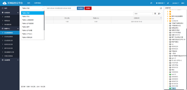 可查询辖区内一个或多个监测站点的历史数据。根据需要选择相应的站点、时间范围和数据类型(小时数据、日数据、月数据、季数据)进行查询。折线图,饼状图直观对比该时间段内的不同站点同一参数的波动情况,方便对比区别;列表显示具体数据,支持导出和对比分析。